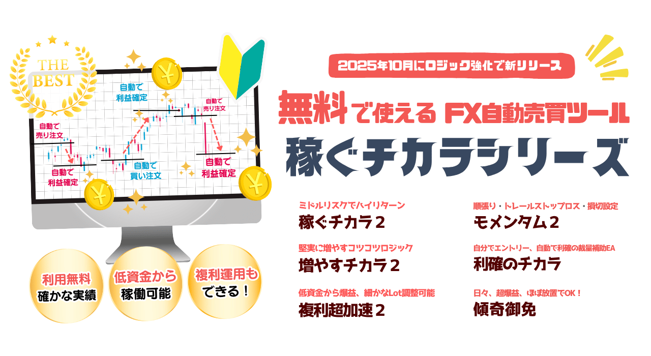 稼ぐチカラのサイト、オープンチャット、公式ライン、SNSなどでは、自動売買システムを使用できるよう情報提供を行っておりますが、FX口座で取引を行うことは自己責任となります。私たちは経済指標の発表がある時など、自動売買では対応できないようなことが起きそうな時に発信を行うことはありますが、投資に関する助言を業としているわけではありません。 自動売買システムを使用して損害が発生した場合でも私たちは責任を負えませんので自己責任で取引を行うようにしてください。 またXMというFXブローカーに関しても私たちは紹介料をもらう立場ではありますが、運営状況等を完全に把握しているわけではありません。海外への会社ですので日本の法律で保護されない点はご注意ください。XMとのトラブルに関しましても私たちや責任を負うことができません。